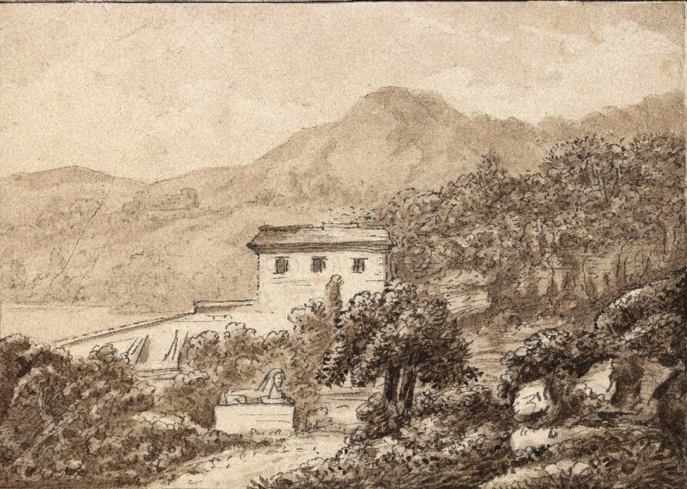 Die süditalienische Landschaft mit Villa am Meer und Sphinx auf halbem Weg gehörte zu einem Skizzenbuch, das Johann Wolfgang von Goethe (1749-1832) während seiner Reise nach Neapel und Sizilien 1787 anlegte. Über die Autographensammlung des Leipziger Verlegers Salomon Hirzel (1804-1877) gelangten auch Zeichnungen Goethes wie diese in die Universitätsbibliothek.